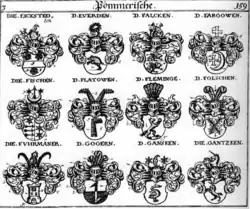 Originally from Hesse, they are direct male-line descendants of the Reginarids and therefore one of the oldest still existing noble families in Europe. They carried the titles Knight, Lord, Count and Freiherr of different dominium plenum and dominium directum. This noble family thrived in the Middle Ages between 1300-1600 and had branches in Hessen, Saxony, Pommern and Westphalia (County Mark and Fbd. Münster) Falken.[3] The coat of arms this family used in Hessen and Thüringen and Saxony is different from the branch who was ruling parts of Pommern and Westphalia. The latter used a Griffin which was derived from the coat of arms of the "Greifenhaus" in Pommern. The griffin coat of arms still refers to the coat of arms used in Hessen and Thuringia and Saxony by using the same horns and red and white colours in the horns.