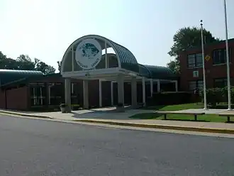Falls Church High School (FCHS) is a high school located in West Falls Church, Virginia, in unincorporated Fairfax County.[3] While the school has a Falls Church mailing address, the school does not serve the City of Falls Church, which is served by Meridian High School. The school serves grades 9 through 12. It was relocated from its former site in downtown Falls Church to the current address in 1967.[4] Falls Church High's school motto is "Building on Our Success." The mascot for the school is a Jaguar. The school colors are dark green and white.[5] The principal is Benjamin Nowak.[6]