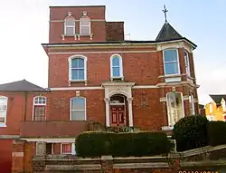 Fambrini appears to have benefited from the rapid growth of Lincoln in the latter half of the 19th century. Many houses of the professional classes in the growing suburbs, as well as commercial buildings have artificial stone mouldings, often in the Gothic Revival style. However, only a few examples of their work can be definitely identified. In 1876 Fambrini had built for himself the large house on the corner of Monks Road (95 Monks Road) and Baggholme Road, and naturally had artificial stone to decorate it. Fambrini called this Florence villa, but after he died in 1890, his house was renamed Villa Firenze.[10] The Company's offices in Canwick Road were designed to exhibit many of the company's products. The eaves cornice have decorative corbels and banding, with above in parapet a projecting panel decorated with a pendant flag and wreath. Rainwater heads are in the form of monstrous heads. The side entrance facade has similar elaborate architectural detail. Topped with panel bearing Lincoln City coat of arms surmounted by segmental pediment bearing date 1889. Some red terracotta mouldings are used.
