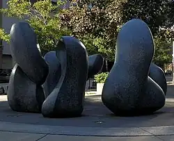 Family is located on the Henry Reuss Federal Plaza and tied to the building it sits in front of. The building was the brainchild of US House member Henry S. Reuss. He believed it would encourage the development of downtown Milwaukee, as well as group thirty federal agencies under one roof. When Reuss made the plans for the new building public, he announced that there would be no federal money given for artwork, explaining that an anonymous donor had offered to donate an outdoor sculpture.[2] Blumenfeld was thus privately commissioned to create Family in the late 1970s. She selected 68 tons of Norwegian blue granite, which she had shipped to Carrara, Italy. Blumenfeld and four assistants proceeded to chisel the five forms. "Family is the first of several of Blumenfeld's multi-component outdoor sculptures. Although her works are abstract, the forms are organic and are intended to symbolize human figures and their relationships. Like members of a family, each of the humanoid figures relates strongly to the others, but retains its separate identity."[2] As the viewer moves the parts, the sculpture changes; the same way that relationships are always changing. Blumenfeld refers to this evolving relationship stating, "One is sometimes stronger, one is weaker. Looking at a family you see the different values placed on each member at different times. I'm trying to show the dynamic tension in a relationship."[3]