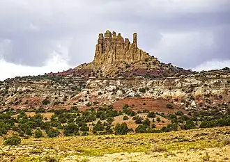 The towers of Family Butte are composed of cliff-forming Wingate Sandstone, which is the remains of wind-borne sand dunes deposited approximately 200 million years ago in the Late Triassic. Below the towers is strata of the upper and lower members of the slope-forming Chinle Formation, also of Late Triassic age. The Chinle overlays the Moody Canyon and Torrey members of the Moenkopi Formation (Early Triassic) which covers the surrounding terrain.[4] These rocks were uplifted during the Laramide Orogeny and subjected to forces of erosion which created the butte left standing today.