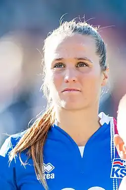 She played matches at the 2011 FIFA Women's World Cup qualification, 2010 Algarve Cup, 2011 Algarve Cup and UEFA Women's Euro 2013 qualification[17] before scoring her first goal for Iceland on 5 March 2012 in a 1–0 win over China at the 2012 Algarve Cup.[19] Her second goal came on 15 September 2012 at a UEFA Women's Euro 2013 qualification 2–0 win over Northern Ireland.[19]