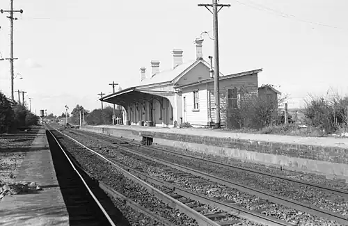 Eastbound view showing station building before demolition