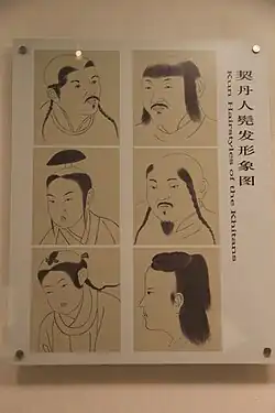 Kithan's men hairstyle was called kunfa (髡髮) according to Chinese texts.[7]: 21 Khitan wore the long side fringes & shaved pates.[11] Tomb murals of Khitan hairstyle show only some hair remaining near the neck and forehead with the rest of the head shaved.[12] Only at the temples were hair left while the crown was shaven.[10] The absence of Khitan clothes and hairstyles on a painting of riders previously identified as Khitan has lad to experts questioning their purported identity.[13] Khitan males grew hair from their temples but shaved the crown of their heads.[14] Khitan men might have differentiate between classes by wearing different patterns on their small braids hanging off their shaved foreheads. They wore the braids occasionally with a forehead fringe with some shaving off all the forehead.[3]: 53, 190 Khitan men left only two separate patches of hair on each of the forehead's sides in front of each ear in tresses while they shaved the top of their head.[14]