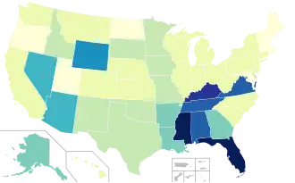 As of 2008, over 5.3 million people in the United States were denied the right to vote due to felony disenfranchisement.[18] In the national elections in 2012, the various state felony disenfranchisement laws together blocked an estimated 5.85 million felons from voting, up from 1.2 million in 1976. This comprised 2.5% of the potential voters in general. The state with the highest number of disenfranchised voters was Florida, with 1.5 million disenfranchised[19] because of a current or previous felony conviction, over 10% of the voting age citizens, including the 774,000 disenfranchised only because of outstanding financial obligations. In October 2020, it was estimated that 5.1 million citizens were disenfranchised for the 2020 presidential election on account of a felony conviction, 1 in 44 citizens.[3]