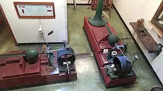 Bosch-Omori Seismographs are made of two units, one to detect movement North to South and the other East to West. Each has a pendulum which can pivot, restrained by a flexible wire and have a recording needle which traces on smoked paper, controlled by a weight-powered timepiece.[17]