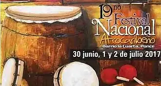 Festival Nacional Afrocaribeño (National Afro-Caribbean Festival) is an annual cultural celebration held at Ángel "Cuqui" Mangual baseball field[8][9] in the La Cuarta neighborhood of Barrio Capitanejo in Ponce, Puerto Rico. The celebration, which commonly lasts three days, takes place in late June. It has been called "a world-class" event that brings together "the best exponents of salsa, bomba, plena and merengue music".[10] It is attended by some 30,000 people.[11] The festival's purpose is to positively impact the region by creating a cultural space to help preserve traditions.[12] It aims to highlight the contributions to Puerto Rico culture and society by Puerto Ricans of African heritage. The festivities are highlighted by bands playing salsa, bomba and plena music.[13]