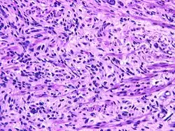 A hematoxylin and eosin stained image (high power) of the short spindle cells of a fetal rhabdomyoma.