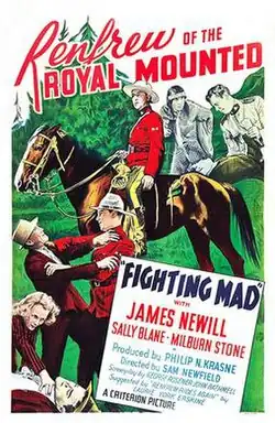 Fighting Mad is a 1939 American adventure film directed by Sam Newfield and written by George Rosener and John Rathmell. It is based on the 1927 novel Renfrew Rides Again by Laurie York Erskine. The third of the Renfrew of the Royal Mounted film series stars James Newill, Sally Blane, Benny Rubin, Dave O'Brien, Milburn Stone and Walter Long. The film was released on November 5, 1939, by Monogram Pictures when Grand National Pictures ceased operation.[1][2][3]