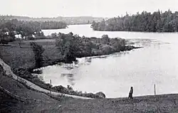 Findley Lake was settled by War of 1812 veteran Alexander Findley, a native of Northern Ireland who had emigrated to America sometime around 1769, settled in eastern Pennsylvania, married and started a family, and returned to Ireland for a few years before making the decision to live permanently in the United States. After purchasing land in Greenfield, Pennsylvania, in 1805, he then purchased lot 52, near what is now Findley Lake, from the Holland Land Company in 1811,[2] and built a dam there in 1815 to power his mill, thus creating the lake from two ponds. The settlement that grew up around the mills prospered.