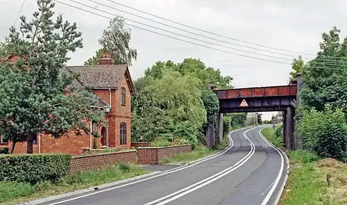 Finmere station was on the Great Central Main Line, the last English main line - built in 1899, and the first to be closed in 1966.[1] The section of the line between Brackley Central and Quainton Road was to be constructed by Walter Scott & Co., civil engineers from Newcastle-upon-Tyne at a cost of £420,000. The construction of the section through Finmere necessitated considerable earthworks, the remains of which can still be seen today. To the north, a cutting of 180,000 cubic yards had to be excavated, while to the south the railway crossed an embankment which required the excavation of nearly 200,000 cubic yards. The earthworks were required as a consequence of the Great Central's policy to eliminate level crossings on the London Extension, regarding them as a source of danger, inconvenience and cost. This resulted in the construction of bridges for crossings both large and small, including a timber overbridge to the north of Finmere for the convenience of the local Grafton Hunt.[2]