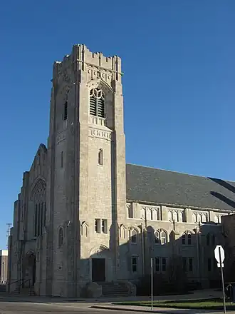 First Baptist Church is a historic Baptist church located at 309 E. Adams Street in Muncie, Indiana. The Late Gothic Revival building was designed by Samuel Hannaford & Sons and constructed in 1928–1929 by Morrow & Morrow. It is constructed of Indiana limestone and has a cruciform plan. It features and engaged five-story tower.[2]: 75