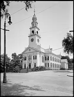The first church building was a crude log cabin thatched with grass.[1] Beyond the church, the Puritans founded the first elementary school supported by public money in the American colonies. They held the first Town Meeting at the church, also called a Meetinghouse, which determined policy through open and frequent discussion. The congregation's fifth building burned in February 1896, and the current building was completed in 1897.[2]