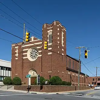 First Reformed Church, also known as the First Reformed United Church of Christ, is a historic Reformed church located at 22 E. Center Street in Lexington, Davidson County, North Carolina. It was designed by architect Herbert B. Hunter and built in 1927–1928. It is a steel frame building sheathed in tapestry brick, with a Late Gothic Revival-style interior. It features a pair of corner towers of uneven height, pointed-arched portal, and a stone and stained glass rose window.[2]