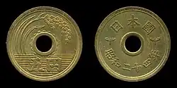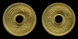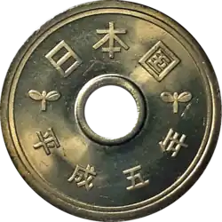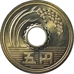 The 5-yen coin (五円硬貨, Go-en kōka) is a denomination of the Japanese yen. The current design was first minted in 1959, using Japanese characters known as the "new script" and kanji in the kaisho style, and were also minted from 1948 to 1958 using "old-script" Japanese characters in the gothic style.[1] Five-yen coins date to 1870 (when, due to the much higher value of the yen, they were minted in gold). The modern-day coin was first produced in 1948 with a differently styled inscription. This was changed in 1959 and the design has remained unchanged since.