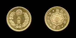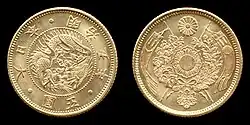 Five yen coins were first struck in gold for the Japanese government in 1870 at the San Francisco Mint.[2] During this time a new mint was being established at Osaka, which did not receive the gold bullion needed for coinage until the following year.[3] The yen as a unit of currency was officially adopted by the Meiji government in an act signed on June 27, 1871.[4] For this particular denomination, its not known if any five-yen coins dated 1871 (year 4) were actually struck that year as official records have coinage beginning in 1872.[5][6] The first and second five yen coin designs feature a dragon figure on the obverse surrounded by legends, while the reverse features the emblem of the Imperial family.[a] Each coin was initially struck in .900 fine gold with a weight of 8.3g, and a diameter of 23.8mm.[7] The diameter was later reduced to 21.8mm when the second design was introduced in 1872.[8] Five yen coins continued to be struck uninterrupted until 1879, when for an unknown reason none were recorded as minted. Coinage resumed in 1880 and remained unchanged until 1897 when Japan officially switched from a silver standard to a gold standard.[9] During this time the gold five yen coin was given a third and final new design. The diameter was reduced from 21.8mm down to 16.9mm, and the weight was changed from 8.3 to 4.2 grams. Redemption of old silver coins for new gold coins at par began on October 1, 1897, and lasted until closure on July 31, 1898.[10][11]