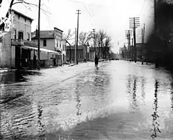 During early 1916, heavy rains caused floods throughout Southern California, virtually cutting off San Diego County from the rest of the state for the greater part of a month.[19] Due to the floods 28 people died and about ten million dollars in damages were caused, with the greatest losses occurring in San Diego County, where twenty-two people died mostly in Otay River valley when the Lower Otay Dam failed, releasing the contents of the Lower Otay Reservoir.[19] Another estimate, was that fifty lives were lost in San Diego County.[20] Among the dead was an early Japanese American colony.[21] San Diego residents blamed the floods on Charles Hatfield who was hired by the city of San Diego to create rain.[22]