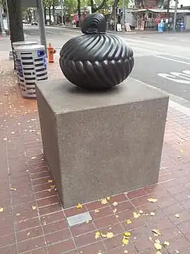 Mark Calderon's Floribunda (1998) is a bronze sculpture installed at the southwest corner of the intersection of Southwest 5th Avenue and Stark Street in the Portland Transit Mall. The sculpture, part of a series of works created by Calderon in the 1990s based on hairstyles found in 12th- and 13th-century Japanese Buddhist sculpture,[1] measures 23 inches (58 cm) x 23.5 inches (60 cm) x 23.5 inches (60 cm).[2] Floribunda is the only free-standing piece from the series, but according to the Regional Arts & Culture Council, which administers the work, "much of his work from that period was inspired by religious images of ancient cultures and consisted of larger than life-size pieces—head-like in form—meant to be displayed on a wall".[2] The sculpture is part of the City of Portland and Multnomah County Public Art Collection courtesy of the Regional Arts & Culture Council.[3]