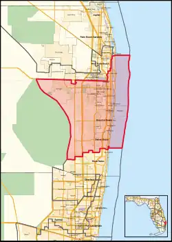 Florida's 22nd congressional district is a U.S. congressional district in Southeast Florida. In the 2020 redistricting cycle, it was drawn as a successor to the previous 21st district and includes Palm Beach, West Palm Beach, Boynton Beach and Delray Beach, as well as unincorporated Palm Beach County. The previous iteration of the 22nd district, which extended from Fort Lauderdale to Boca Raton, was instead renamed the 23rd district.