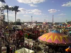 The Florida State Fair is held annually at the Florida State Fairgrounds in East Lake-Orient Park, Florida. The official state fair of Florida, it includes indoor and outdoor exhibits, rides and shows.[2] It is a chance for the state to showcase its agricultural industry.[3] The Fair also offers competitions and food oddities such as chocolate covered bacon & Buffalo chicken chimichanga.[4] The annual event is usually held in February and typically lasts for 11 days.[5] It is the first state fair to be held in the United States each calendar year.[6]