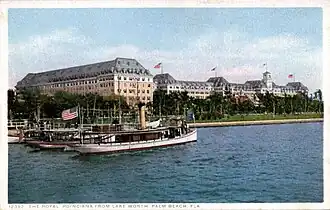The Royal Poinciana Hotel from Lake Worth, Palm Beach c. 1909 was the venue for the championships from 1910 till 1931.