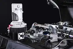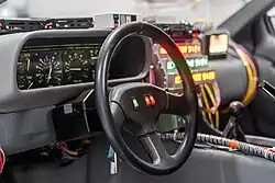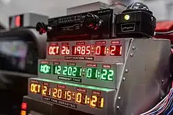 Three DeLoreans used were purchased from a collector—one for stunts, one for special effects, and one for normal shots.[29][31] They were unreliable and often broke down.[23] 88 mph (142 km/h) was chosen as the time travel speed because it was easy to remember and looked "cool" on the speedometer.[32] A custom speedometer was built to simulate 88 mph, as a 1979 law passed by then-President Jimmy Carter had limited speedometers to 85 mph to reduce speeding.[30] The Flux Capacitor, necessary for time travel, was called the Temporal Field Capacitor; Zemeckis said the name was not believable. From his work on the 1979 drama The China Syndrome, Fink had learned of neutron flux. He and Zemeckis simultaneously suggested renaming it the Flux Capacitor. Cobb and Probert had already placed the Flux Capacitor on the external and interior roof of the DeLorean. Fink placed it next to the driver.[28] Fink constructed the device using a NEMA box and backlit Torr High-Voltage relays. The time display was constructed from LMB boxes. When Fink left, he picked Michael Scheffe to replace him. Scheffe finished the Flux Capacitor build and built the "Mr. Fusion" replacement power supply out of a Krups coffee grinder.[28]