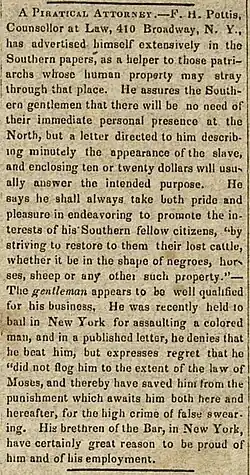Pettis' later career as a slave catcher took advantage of the nature of fugitive slave laws and in jurisdictional differences in the rights of individuals in various U.S. states.[20] If Pettis got hold of a fugitive slave living in a free state, and could convince a court of that person's identity as escaped chattel, he was empowered to return them to that person's legal owner in a slave state.[21] Thus, even reaching a "free state" like New York was no guarantee of liberty for a freedom-seeking American slave. As a rule, Pettis would advertise in Southern papers, instructing "masters who desired his services...to forward him power of attorney, a description of the runaway, 'and also a fee of $20'."[20] If the slave was to be returned to his or her owner, that would cost an additional $100.[20]