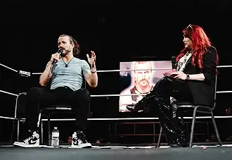 ![]() SoCalVal interviews Adam Cole inside the ring at For the Love of Wrestling 2023 | |