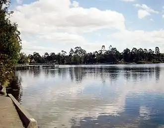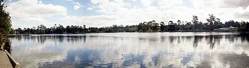 The centrepiece of Forest Lake is an $8.9 million, 10.9 hectare man-made recreational lake, with a perimeter of 2.7 kilometres (1.7 mi). $1.8 million was spent on the dam wall, outlet structure and boulevard embankment. It has an average depth of 2.6 metres with a 300 to 600 mm around the safety ledge, deepening to 4 metres in the centre. The volume of the lake is 310,000 cubic metres or 269 Olympic sized swimming pools. Surrounding the lake is 3.5 kilometres of pedestrian and cycleways and 8 hectares of adjacent parkland. It was completed and opened in 1994.[3]