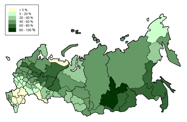 The forest cover in Russia by federal subject as published by the Unified Interdepartmental Statistical Information System. As of 2021 49.4% of Russia is covered in trees.[2]