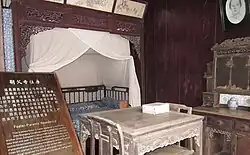 This is where little Zhou and his mothers lived. Zhou is the eldest grandson of his family. His parents gave him the name "Da Luan" (大鸾. It is a kind of bird which is similar to a phoenix. In China, these birds symbolizes auspice and happiness.) He has three mothers. First is his biological mother, Mrs Wang (万十二姑). Mrs Wan was educated in the family school for about 6 years. So she paid attention to Zhou's education. The second mother is Mrs Chen. Mrs Chen is Zhou's adoptive mother and also his aunt. Zhou's uncle was seriously ill and dad no child. In old days in China, there was a saying that of all who lack filial piety, people who has no children are the worst. (不孝有三,无后为大) So the couple adopted Zhou in order to make his uncle happy and remove his disease. (In the old days, it was called "冲喜 Chongxi") Mrs Chen was born to a scholarly family and was a typical Chinese woman. Her father was a Xiu Cai in the Qing Dynasty. So she taught Zhou a lot of knowledge. When he was 4 years old, Mrs Chen taught him some Chinese words and some poetry of the Tang Dynasty. Zhou was sent to the family school at the age of 5. After school, Zhou always listened to Mother Chen telling some historical stories. Zhou read Three Character Classic (三字经), Thousand Character Classic (千字文), Great Learning (大学), The Analects (论语) and Mencius (孟子) with the help of Mother Chen. The third mother of Zhou is Mother Jiang. Mrs Jiang was Zhou's wet nurse. She was a peasant woman. The characters of the plain peasant woman also influenced Zhou a lot. However, his mothers didn't accompany him for a long time. His biological mother died of Pulmonary disease at the age of 35 in 1907. One year later, his adoptive mother Mrs Chen also died. When he was 12, his father's elder brother brought him to the Northeast. As a result, he had to say goodbye to his wet nurse. These three women influenced Zhou Enlai greatly during his life.[3]