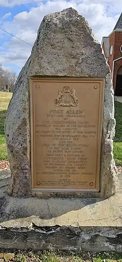 2. ^ "Fort Allen" and "Fort Allen Plaque," in "Pennsylvania Historical Marker Search." Harrisburg, Pennsylvania: Pennsylvania Historical and Museum Commission, retrieved online September 7, 2019.