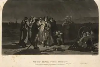 An engraving depicting the evening council of George Washington at Fort Necessity.