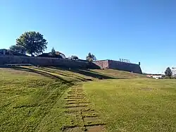 The main access is through a gate on the south side, through a drawbridge over the moat, which is currently backfilled. There are secondary accesses on the East and West sides, all leading through tunnels to the Field-of-Arms.[1]