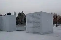 Roosevelt Island was named in honor of the former president in 1973, and the planners announced their intention to build a memorial to Roosevelt at the island's southern tip.[2] In 2005, William J. vanden Heuvel, a former U.N. ambassador and a founder of the Franklin and Eleanor Roosevelt Institute, launched the effort to get the four-acre park built to Kahn's specifications, gathering more than $50 million in private and public funds.[3] The Franklin and Eleanor Roosevelt Institute subsequently kept the project going over time.[4] Two foundations that became major donors, the Reed Foundation and the Alphawood Foundation, initiated a lawsuit against the corporation that managed the development of the memorial in a dispute over how their contributions should be acknowledged. The foundations said they were promised their names would appear close to the bust. Those responsible for the memorial's construction did not dispute that. Rather, vanden Heuvel said: "Yes, we have a contract that we believe is now a mistake. As we came to the spring of 2012, we understood that we had a work of art, and the forces that represent the artistic and cultural integrity of the project are concerned about preserving that work. The purity and integrity of the Kahn memorial is what made it so stunning."[5]