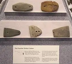 The Fourche Maline culture (pronounced foosh-ma-lean)[a] was a Woodland Period Native American culture that existed from 300 BCE to 800 CE,[2] in what are now defined as southeastern Oklahoma, southwestern Arkansas, northwestern Louisiana, and northeastern Texas. They are considered to be one of the main ancestral groups of the Caddoan Mississippian culture, along with the contemporaneous Mill Creek culture of eastern Texas.[3] This culture was named for the Fourche Maline Creek, a tributary of the Poteau River.[b] Their modern descendants are the Caddo Nation of Oklahoma.