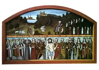 Devotion to these saints began in that region on 24 September 1445 when Hermann Leicht, the young shepherd of a nearby Franciscan monastery, saw a crying child in a field belonging to the nearby Cistercian monastery of Langheim. As he bent down to pick up the child, it abruptly disappeared. A short time later, the child reappeared in the same spot. This time, two candles were burning next to it. In June 1446, Leicht saw the child a third time. This time, the child bore a red cross on its chest and was accompanied by thirteen other children. The child said: "We are the fourteen helpers and wish to erect a chapel here, where we can rest. If you will be our servant, we will be yours!" Shortly after, Leicht saw two burning candles descending to this spot. It is alleged that miraculous healings soon began, through the intervention of the fourteen saints.[14]