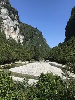 The river valley is characterised by limestone escarpments, with steep sloping faces beneath. The forest type on these slopes is variable in height and composition. Common species include the nīkau palm (Rhopalostylis sapida), and tree ferns (especially mamaku (Sphaeropteris medullaris), pigeonwood (Hedycarya arborea), māhoe (Melicytus ramiflorus), kāmahi (Weinmannia racemosa), and hīnau (Elaeocarpus dentatus), but nīkau and mamaku are often the most common. Above the steep slopes there are some large northern rātā (Metrosideros robusta) and rimu (Dacrydium cupressinum), with occasional miro (Prumnopitys ferruginea). Rimu and miro are mainly present on the more gentle slopes, while northern rātā is the only emergent tree on the steeper slopes below escarpments.[5]