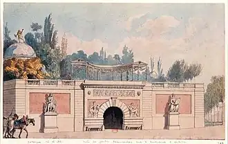 Ten years later he purchased the position of chief architect to Monsieur, the comte d'Artois, brother of Louis XVI, thanks to the protection of the marquis de Voyer, Marc-René de Voyer d'Argenson, famous patron of that time. For him Bélanger designed and constructed the party pavilion Château de Bagatelle in the Bois de Boulogne, 1777, winning his patron's bet with the Queen by completing the house in sixty-three days (and nights) and introducing décors in the style Étrusque. Bélanger constructed the Folie Saint James, a French landscape garden, in Neuilly from 1777 to 1780, and worked for the comte d'Artois at the Château of Maisons-Lafitte. During the Revolution he spent some time in the prison of Saint-Lazare.