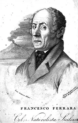 Francesco Ferrara was born to parents of little means from the town of Trecastagni in Sicily, but was sent to study by the age of 11 years to Catania under professor Benedetto d'Agata. In 1778, he began study natural history at the University of Catania, and studied the eruption of Etna occurring the next year. In Catania, he studied multiple disciplines. In 1788, he befriended Lazzaro Spallanzani, who had come to study the volcano. In 1792, he entered the priesthood. In 1814, he was made professor of physics and mathematics at the University of Catania. In 1814, he was named royal intendent of the antiquities of Sicily. He then gained the appointment as professor of Natural History at the University of Palermo. King Francis I of the Two Sicilies knighted him. He also received honorary membership in a variety of medical societies. Ferrara was prolific and wrote numerous books on diverse topics.