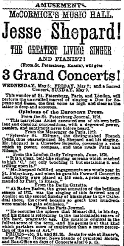 Shepard traveled in Europe, finding audiences among royalty, and impressed the French novelist Alexandre Dumas fils. Shepard was described by contemporaries as tall, dark, handsome, and with hands that could reach over an octave on a piano keyboard.[3][6] He became involved with Spiritualism while in Russia in the 1870s and stated that many of his musical performances were the result of the spirits of famous composers channeling through him.[7][8]