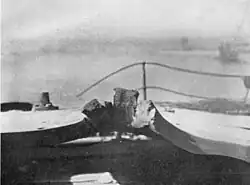 In the Transmitting Station below the armoured deck, Stoker 1st Class William Yeo was entrusted with passing on Harvey's last orders. The magazine was consequently flooded and locked up within minutes of the hit. However the cordite charges which had fallen down from gun house after the hit were not removed to safety, and there were still ready charges in the working chamber. A large number of crewmen still remained in the shell room, magazine handing room and working chamber. The fire which was thought to have been put out after the hit on the turret gained strength and ignited the remaining cordite charges, setting off a large explosion at 16:28 which killed the turret crewmen, the flame of the explosion reaching as high as the top of the ship's masts. Even with the precautions taken in hand, the magazine doors were later found to be severely buckled – only the seawater in the magazine behind it prevented the blast reaching inside.[18] Other ships of the battlecruiser fleet were less lucky; at about the same time as Harvey's death, HMS Indefatigable was torn to pieces by a series of magazine explosions that claimed 1,013 lives and just minutes after that HMS Queen Mary exploded "like a puffball" in one huge column of grey smoke, killing 1,275 sailors.[19] Hours later during the main battlefleet engagement, Rear-Admiral Horace Hood's flagship HMS Invincible was destroyed with 1,032 lives. All three ships were lost as the result of magazine explosions similar to the one narrowly avoided on Lion.[19]