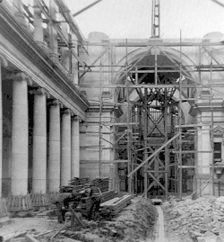 Cathedral of The Blessed Sacrament, Christchurch, under construction. The nave is lined with Ionic columns.