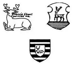 Skeat's works employ crisply drawn figures on a largely clear glazed background, which was a popular formula in post-war stained glass.[7] The panels he created for St John's church in St Albans bear his marks described as "a hart lodged at gaze in a small shield within a larger shield with walled top and alternate horizontal sections" and a "scrolled shield with a hart statant". The hart is taken from the Arms of the county of Hertfordshire. The lines across the shield are an allusion to a ford, a pun on the county's name.[3] His mark later became a rebus, St Francis of Assisi, around whom radiate small flying birds, together with his initials.[3]