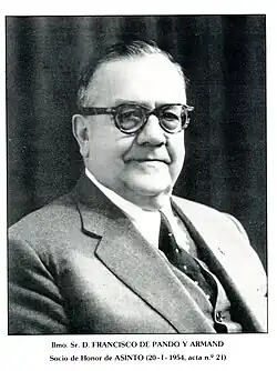 Francisco de Pando y Armand (1900-1977) was a sugar estate owner in Cuba known for his influential leadership in the Cuban sugar industry. He was owner of four sugar producing estates, with land holdings in excess of 24,000 acres. de Pando engaged in corporate and political activities and held interests in various railways and banks.