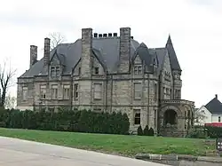The mansion was built in 1891 for the Buhl family, which owned the Sharon Iron Works. The ashlar sandstone residence has 2+12 storeys. Noted Youngstown architect Charles Henry Owsley (1846–1935) designed it in the Richardsonian Romanesque style. The mansion features round arches, steep gable wall dormers, an inset porch with heavy arches, stone finials, and several turrets with copper capped spires. Although the house had been converted to apartments, it was restored. It currently operates as a bed and breakfast and wedding venue.[2][3][4]