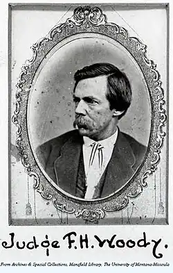 Frank Hargrave Woody (December 10, 1833 – December 16, 1916) was, among many occupations, the first mayor of Missoula, Montana. He was born in Chatham County, North Carolina and attended New Garden Boarding School in Greensboro, North Carolina. After teaching for several years he began moving westward in 1852 before eventually settling in what was then called Flathead county (today's Ravalli and Missoula Counties) in Washington Territory where he was paid to drive supplies for trade with the native populations.[1] Woody accompanied Christopher P. Higgins and Frank Worden in the establishment of Hellgate Village and later Missoula, Montana.[2]