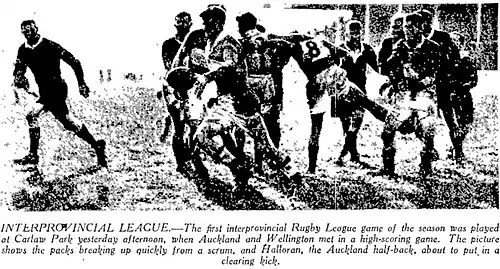 Halloran was then selected to make his Auckland debut against Wellington. It was not a full strength Auckland side as the match was a curtain raiser to the Auckland Pākehā match against Auckland Māori (Tāmaki) with both sides featuring a huge number of New Zealand and Auckland representatives. Halloran was chosen by selector Bert Avery at halfback to play alongside his Ponsonby teammate Walter Stockley who captained the side.[72] He played opposite Wellington halfback, J. Coman who was a former Wellington rugby union representative player.[73] Auckland won the early match 25–22 with the Herald publishing a photograph of Halloran shaping to kick after gaining possession from a scrum inside their own half.[74] With the scores tied 3-3 Halloran was involved in a passing movement after Ross Jones gathered the ball and gave it to J. Peterson who passed to Halloran, who gave it on to Stockley who scored.[75]