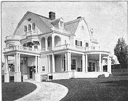 The Frank J. Cobbs House is a three-story Colonial Revival house with clapboard siding and a gambrel roof clad in red cedar shingles.[2] The center of the front facade projects slightly forward and is surmounted by a gambrel-roof gable. One end of the house has a gable-roofed wing, while the other has what was once a porte cochere, which is now enclosed with an added second story room. The central portion of the facade projects slightly forward of the primary facade plane and is topped by a gambrel-roof gable. The exterior contains a variety of decorative elements, including a Palladian window, windows with molded caps, round-head dormers, and fluted columns and pilasters.[2]