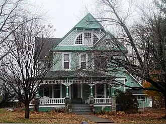 The Frank Stewart House, also known as the Marian Stewart Bailey House, is a historic building located in Washington, Iowa, United States. Frank Stewart was a successful eastern Iowa businessman who was also involved in community affairs.[2] Among other responsibilities, he served as a Park Commissioner in Washington. His only child, Marian Stewart Bailey, also held that position. The house is a two-story, frame, Queen Anne with an asymmetrical design. The structure follows a simple cross-gable plan, but the facade projection is offset. Both gables of the main facade feature decorative millwork of diagonal patterns. There is also a wrap-around porch on the main floor with several porches on the second floor. The house was individually listed on the National Register of Historic Places in 1987.[1] In 2018 it was included as a contributing property in the West Side Residential Historic District.[3]